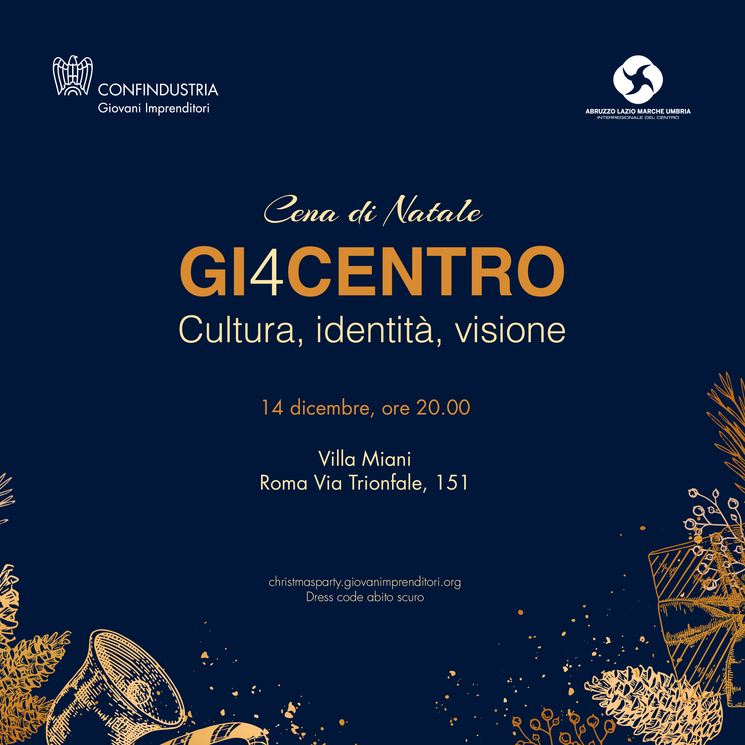 Il Gruppo Giovani Imprenditori è lieto di invitarvi alla tradizionale Cena degli Auguri di Natale Giovani Imprenditori, che si svolgerà a Roma giovedì 14 dicembre alle ore 20.00 presso Villa Miani (Via Trionfale 151, Roma), in collaborazione con i Giovani Imprenditori Confindustria.